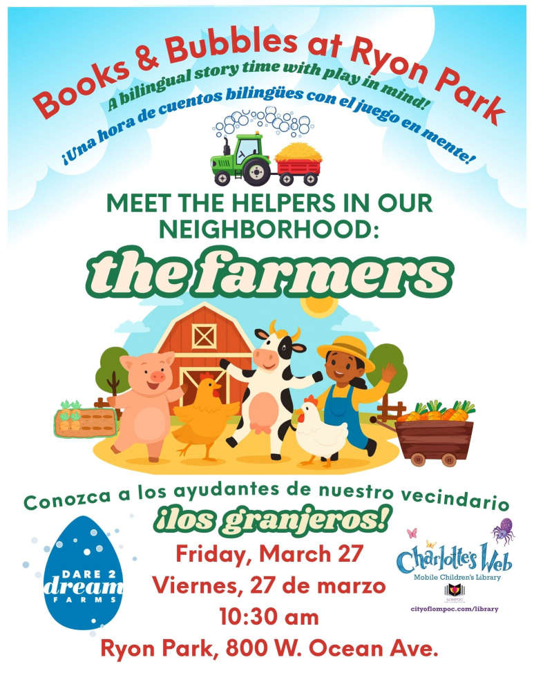 Join the Charlotte’s Web Bookmobile for Books & Bubbles at Ryon Park on Friday, March 27, 10:30 am-noon, at Ryon Park